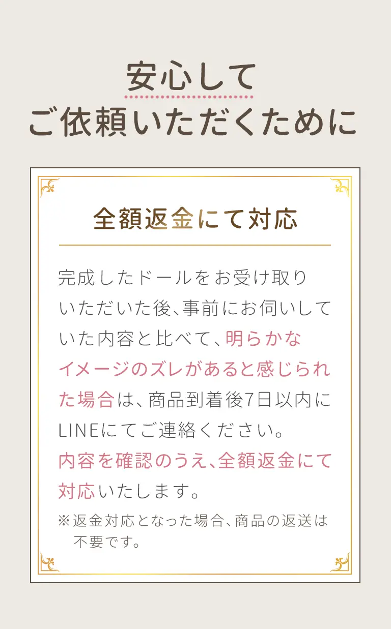 事前にお伺いしていた内容と比べて、明らかなイメージのズレがあると感じられた場合は、商品到着後7日以内にLINEにてご連絡ください。